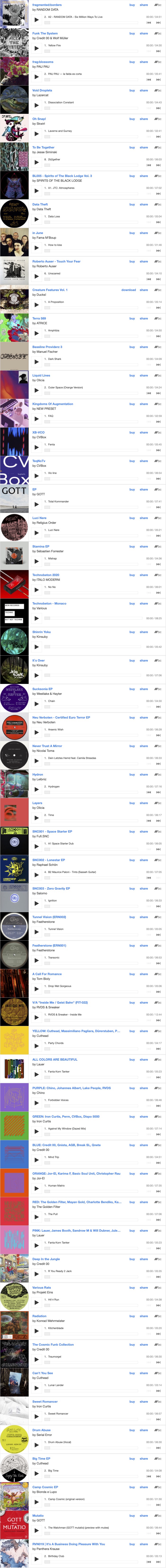 Uncanny Valley, Rat Life, Noton, ARMA, Permanent Vacation, Sameheads, Nein, Let’s Play House /Brooklyn NY, Major Records /Brooklyn NY, FIT Sound /Detroit, Bordello a Parigi, hundert Records, Interference Pattern, Ozelot Rec, Lunatic, Reach Another System, Lustpoderosa, Sons Of Traders, Black Lodge /Los Angeles, Riotvan, SNC, Subject To Restrictions, Infoline, Italo Moderni, Belleville Records, Mattoni Pazzi Studios, Baran, Self Learning System, Fragmented, NOAR, Ernest´s Way /Adelaide, Vortex Traks, Woodland Creatures …